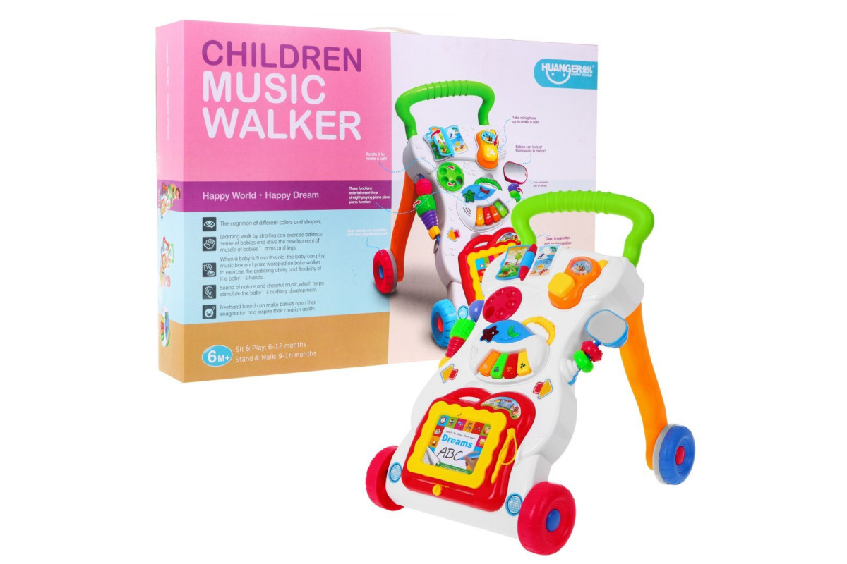 Представляємо інтерактивні ходунки з музичними функціями для дітей від 6 місяців . Він ідеально підходить для малюків, які ще сидять, повзають або роблять свої перші кроки . Штовхач має велику ручку і стійку конструкцію з колесами . Спереду є сенсорна дошка .