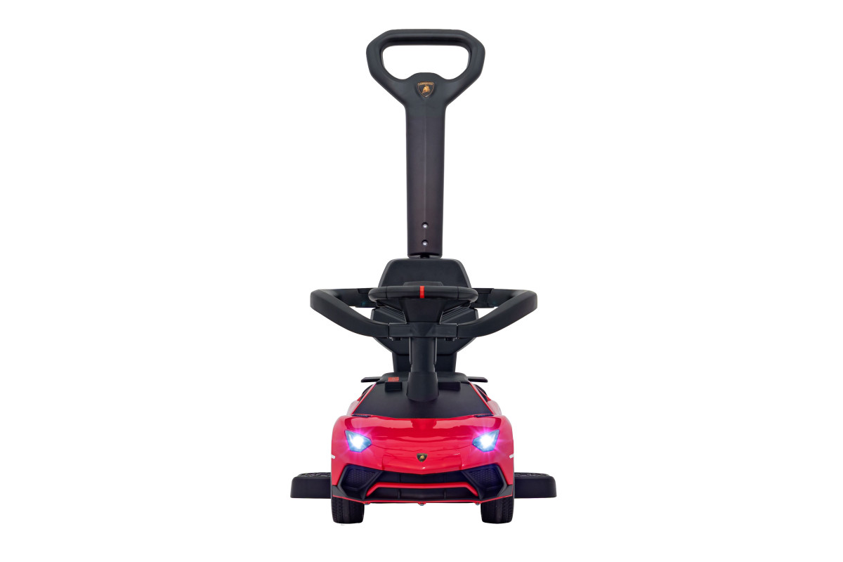 Комфорт і безпека є пріоритетом в Lamborghini Aventador SV pusher. Гумові колеса забезпечують плавну та тиху їзду, одночасно захищаючи підлогу вашого будинку. Зручні підставки для ніг з боків автомобіля дозволяють дитині відпочити під час гри, а кільце навколо катання захищає малюка від падіння. Довга стійка ручка дозволяє дорослим керувати штовхачем , що забезпечує повний контроль над поїздкою та додаткову підтримку для малюка.