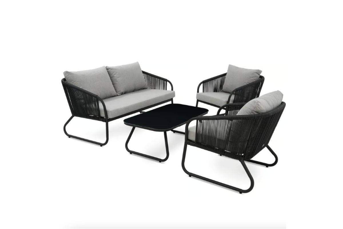 Садові меблі Paso від Di Volio - це ідеальне поєднання функціональності та сучасного стилю. Комплект складається з просторого двомісного дивана і двох крісел, сидіння і спинки яких оснащені товстими м'якими подушками, журнального столика зі скляною стільницею. Меблева конструкція, виготовлена з гнутих сталевих труб графітового кольору та ручного плетення техноротангу того ж відтінку, дуже міцна, стабільна і, перш за все, стійка до зовнішніх погодних факторів, таких як дощ, інтенсивне сонце (УФ-промені), сніг або волога. Прості, модерністські форми меблів і стримані кольори роблять гарнітур Paso чудовим практично в будь-якій композиції, а ваш сад або тераса стануть вашим улюбленим місцем відпочинку на природі.