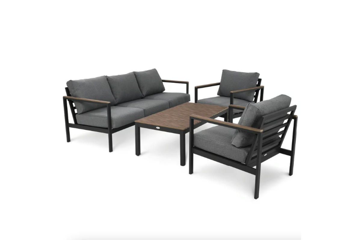 Садові меблі Tivoli були створені з урахуванням комфорту використання, функціональності та елегантності. Набір, що включає тримісний диван, два крісла та журнальний столик, ідеально підійде для облаштування вашого саду або тераси, створить місце для відпочинку та проведення часу з близькими. Конструкція меблів поєднує легкий алюмінієвий каркас з елементами з сучасного полівуд матеріалу, що імітує дерево. Такі матеріали гарантують довговічність, стійкість до погодних умов і стильний зовнішній вигляд меблів. Комплект доповнений м'якими подушками графітового кольору. Завдяки універсальному та позачасовому дизайну меблі Tivoli чудово виглядають як у традиційно, так і в сучасно оформлених приміщеннях.