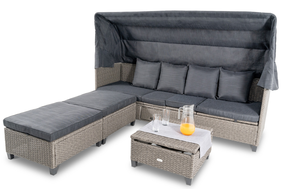 Luca от Di Volio - це набір м'яких меблів, завдяки якому ви зможете прекрасно відпочити на природі з друзями і сім'єю. Ідеально підходить для саду або великої тераси. Комплект складається з 4-місного дивана, двох пуфів і невисокого столика. Диван захищений стінками і навісом - відпочивати можна навіть у вітряну погоду. Меблі Luca виготовлені з високоякісного плетеного штучного ротанга на сталевому каркасі. Така конструкція гарантує, що меблі будуть функціональними і зручними. Диван і пуфи укомплектовані м'якими зручними подушками. Колір ротанга в цьому наборі подібний кольором до натурального ротанга - бежевий відтінок підходить і для скандинавського стилю, і для стилю бохо, а також для балконів і терас, оформлених в класичному стилі.