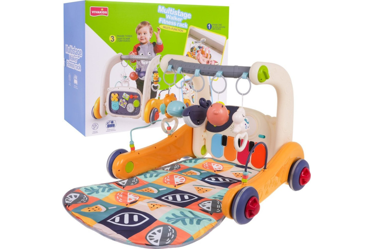 Інтерактивна штовхалка 3 в 1 для дітей з перших днів життя. Килимок виготовлений з увагою до кожної деталі, абсолютно безпечний для малюка, не містить дрібних деталей і виготовлена з безпечних матеріалів. Набір 3в1 росте разом з вашою дитиною. На першому етапі життя (0-6 м) ми можемо використовувати його як інтерактивний килимок. Сидяча дитина (6-12 м) може грати з інтерактивною панеллю або вчитися вставати. З 12 місяців ми можемо використовувати його як ходунки. Набір живиться від 5 батарейок 1,5 В АА, 3 батарейки для панелі та 2 батарейки для дельфіна. У наборі є звукові ефекти з регульованою гучністю і світлові ефекти.Особливості набору: - пушер 3 в 1 – інтерактивний килимок – панель з піаніно,- як інтерактивний килимок ізолює дитину від холодної підлоги,- допомагає зробити перші кроки,- сприяє навчанню ходьби,- навчає кольорів, форм, стимулює уяву,- регулювання гучності,- можливість блокування задніх коліс,- колеса мають гумові протиковзкі накладки,- багатоелементна панель,- панель знімається. Елементи набору: 1. Панель - обертові шестерні, які видають звук при обертанні,- повзунок із зірочкою, який видає звук при русі,- книга перекладів,- будинок з рухомим вентилятором,- регулювання гучності,- кнопка з нотою і кнопка з квадратом активує мелодії в супроводі миготливих клавіш,- барвисте піаніно.- колесо, що активує мікшер і світлові ефекти.2. Сторони штовхача: - шарування бісером.3. Підвіски на верхню пов'язку - єдиноріг з брязкальцем,- печатка з брязкальцем,- дельфін з підсвічуванням,- дельфін з брязкальцем,- бджілка з брязкальцем.