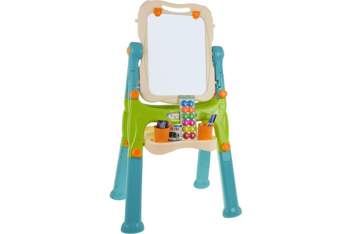 Пропонуємо двосторонню та двопозиційну дошку для стояння з аксесуарами для малювання, ідеально підходить для дітей від 3 років . З одного боку він виглядає як біла магнітна поверхня, з іншого — чорний і крейдяний . Завдяки цьому діти мають у своєму розпорядженні 2 різні поверхні, які дозволяють творчо грати.