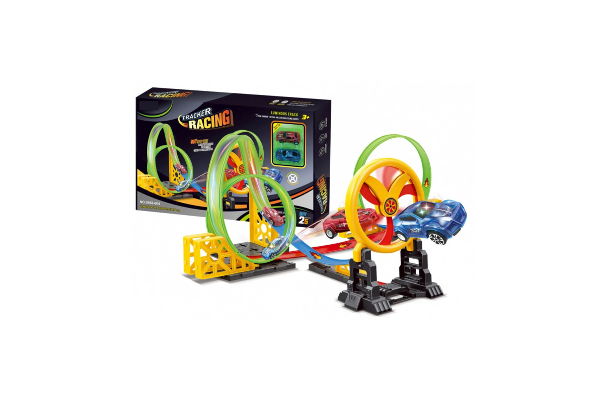 Траса траси дійсно змагальна і подарує неабиякі емоції. Пройшовши цілих 3 цикли, машини розвернуться на 360 градусів , з'їдуть з рампи на повній швидкості і прострибнуть між вентилятором, що обертається . Щоб вражаюча поїздка була успішною, іграшковий автомобіль повинен поміститися між лопатями рухомого обода . Це не завжди вийде, але варто попрактикуватися. Додатковий ефект забезпечує світлодіодне підсвічування гоночних автомобілів.