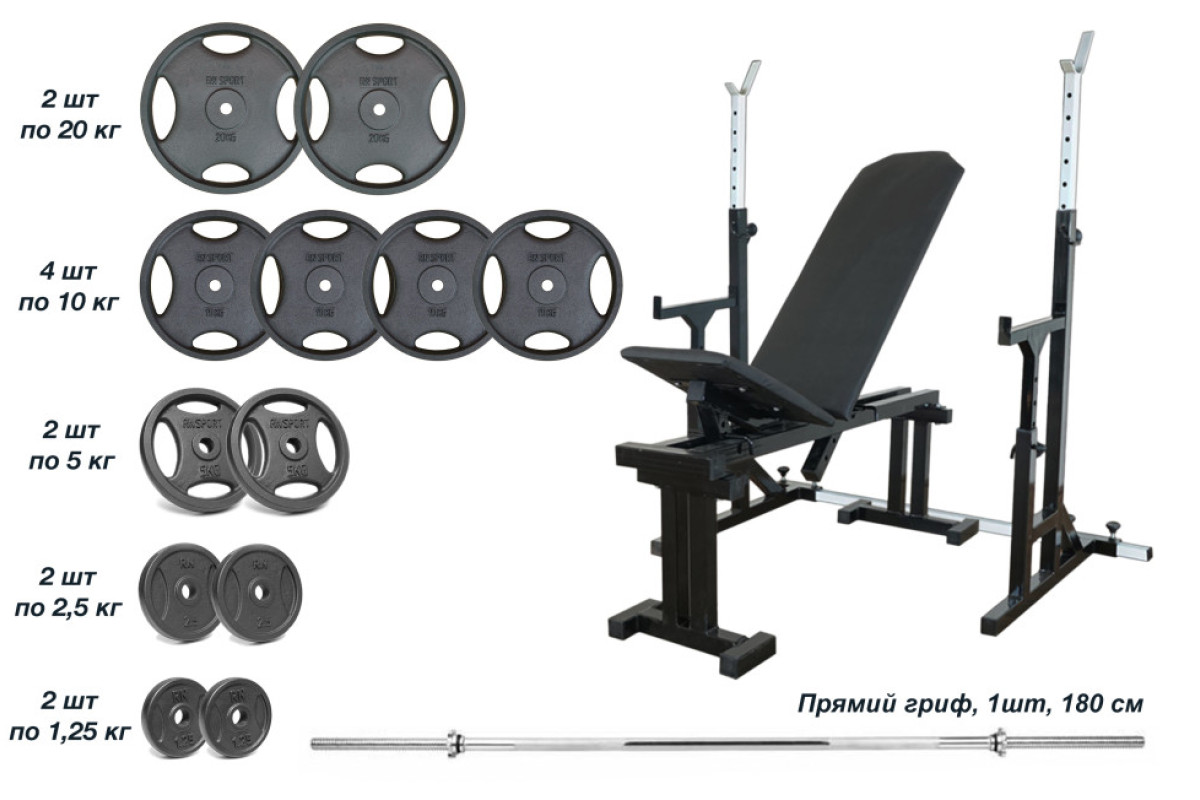 Лавка 090 + Стійки зі страхувальними упорами UM 0150 + Металева штанга RN-Sport Quatro 105 кг