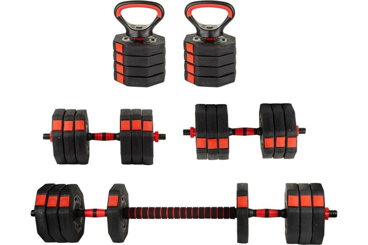Композитний набір 4 в 1 вагою 20 кг з функціями штанги, гантелей, гирі, тренажера для віджимань — це універсальний набір для кожного. Використовується для силових, загальнорозвивальних і реабілітаційних вправ. Тренування з обтяженнями допоможуть сформувати м’язи передпліч, рук, плечей і грудей. Виконувати рух можна стоячи, сидячи або лежачи на тренажерній лаві. Ви можете використовувати гантелі для силових тренувань і комбінацій кардіо вправ.
