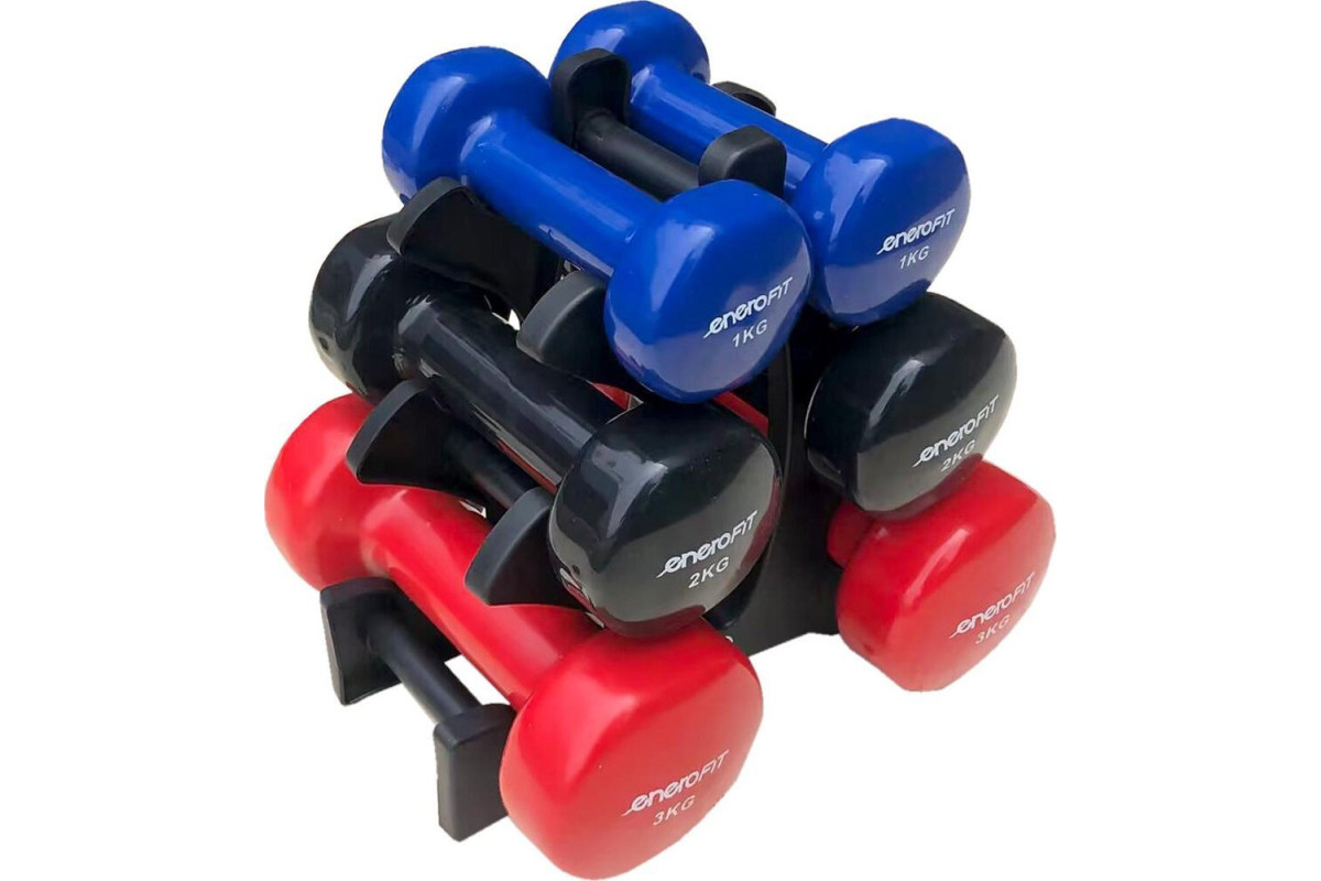 - У набір входить 6 гантелей по дві від 1 до 3 кг