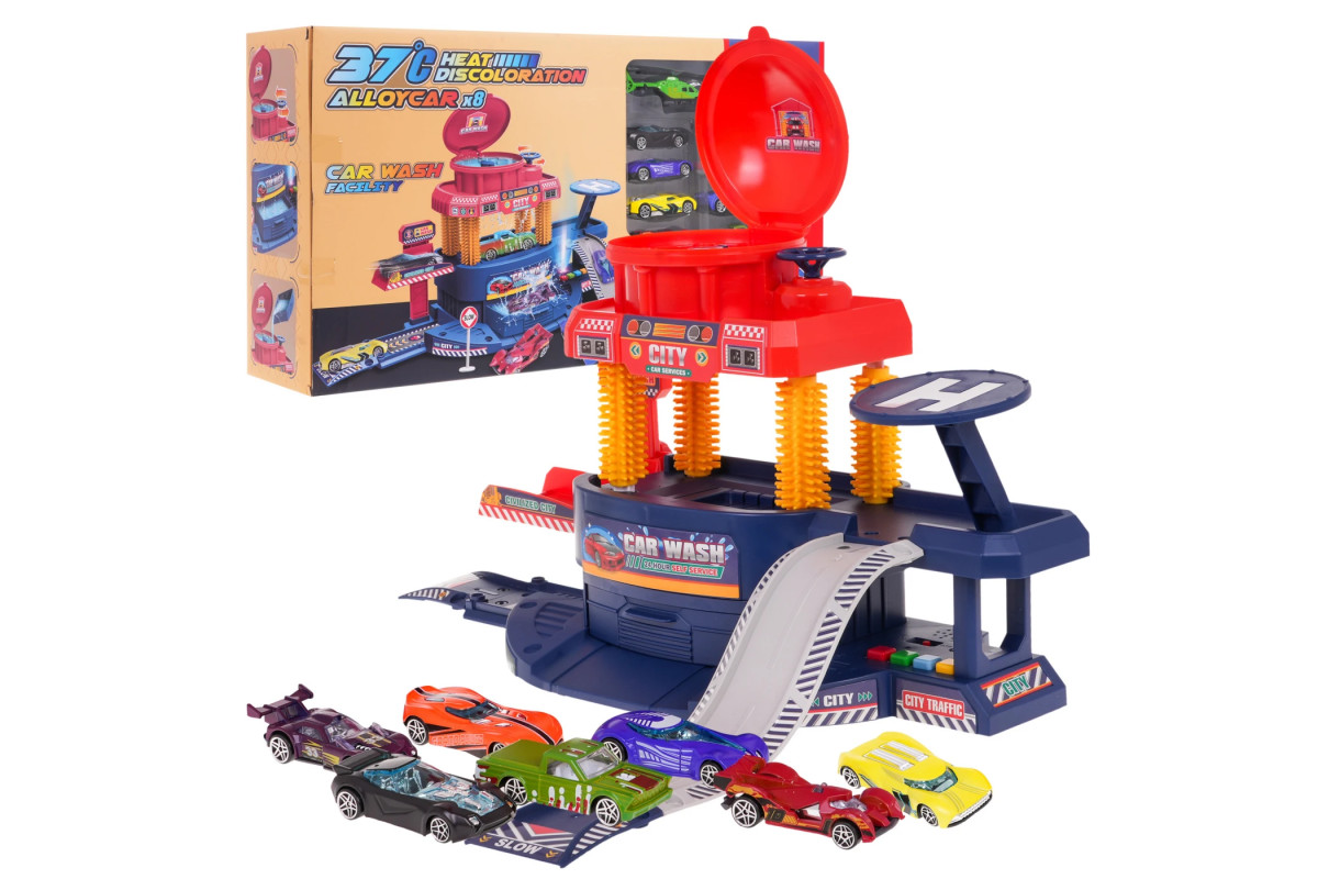 - мийка автомобіля, - 8 транспортних засобів, що змінюють колір, - вертоліт, - дорожні знаки, - інструкція по збірці, - набір наклейок для самостійного декорування автомийки. |