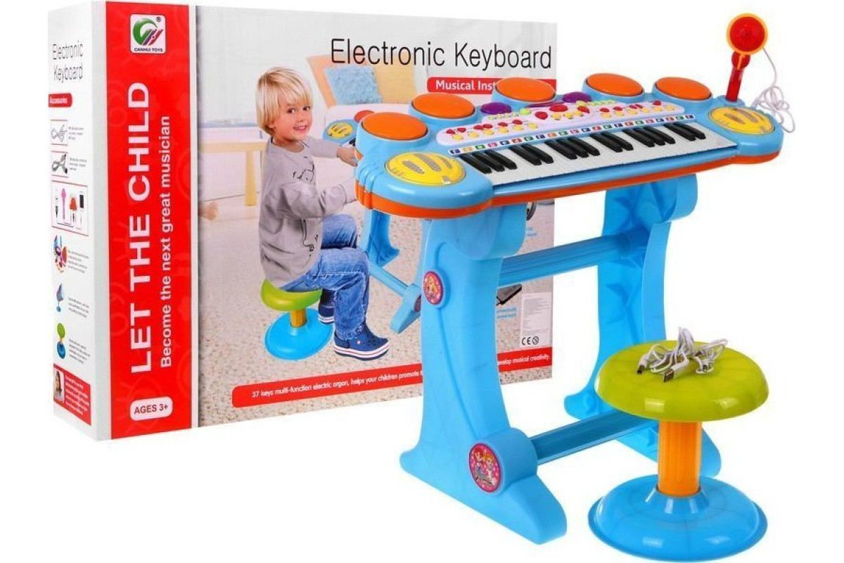 Синій музичний набір з багатофункціональною клавіатурою - це пропозиція для хлопчиків від 3 років, які люблять музику та спів. Великий стоячий синтезатор з інтерактивними функціями та табуреткою стануть чудовою ідеєю творчого подарунка для дітей .