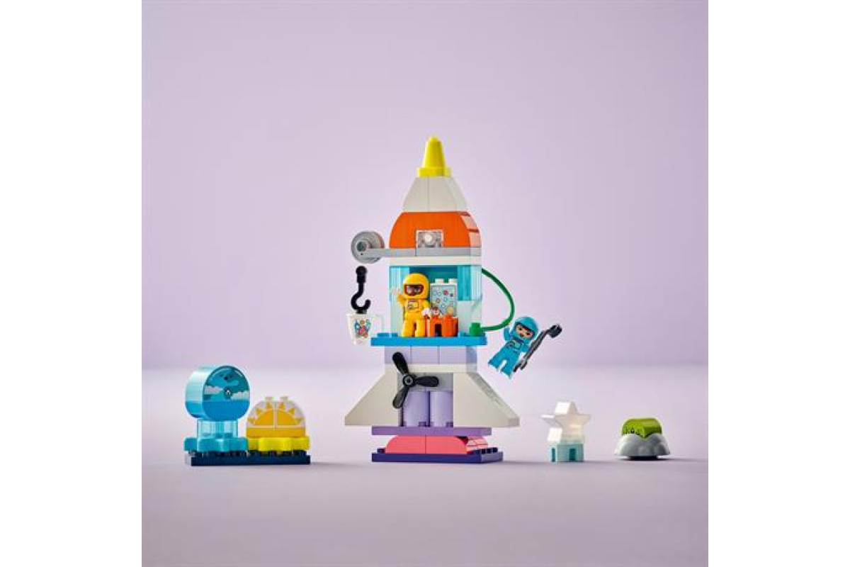 У набір до цієї космічної іграшки входять багато цікавих аксесуарів для творчої гри. Дошкільнята відкривають нові горизонти, вигадуючи веселі космічні пригоди для двох фігурок астронавтів LEGO® DUPLO®. Наприклад, потоваришувати з інопланетянином або вирушити на космічну прогулянку, щоб полагодити шатл за допомогою іграшкового ключа.