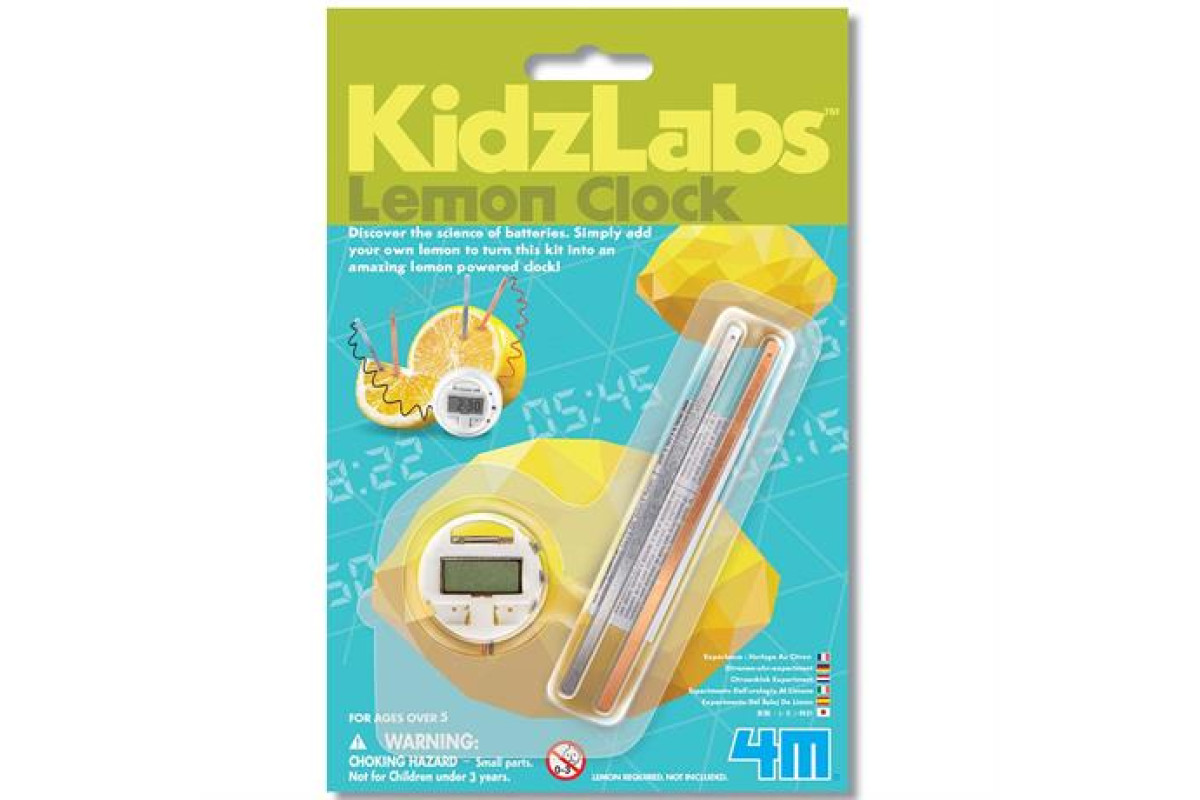 З набором для досліджень 4M Лимонний годинник можна зібрати цифровий годинник, що працює від цитруса замість батарейки. Такий комплект для надзвичайного наукового експерименту сподобається дітям від 5 років.