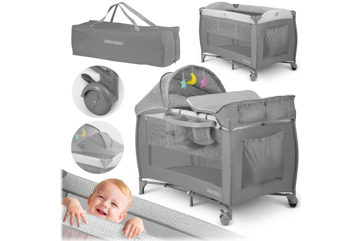Зручне та функціональне розкладне дворівневе туристичне дитяче ліжечко Ricokids - легке з бічним входом, практичною кишенею, відском для іграшок, пеленальним столиком, органайзером. Тканина легко чиститься.
