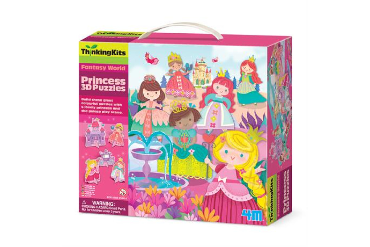 Набір пазлів 4М із серії Thinking Kits буде цікавим дітям від 4 років. Ігри з пазлами сприяють розвитку уяви, творчих здібностей, логічного мислення, тренують дрібну моторику, довільну увагу. Пазли підходять для розвитку за методикою Монтессорі. Підбираючи елементи головоломки, дитина вчиться знаходити зв'язок між частиною та цілим, поєднувати кольори.Набір для розвитку дозволяє зібрати фігурки для ігор у вигляді 6 принцес, карети та замку. Деталі пазлів мають барвисті зображення із двох сторін. Плоский пазл фон складається з дев'яти фрагментів. Найзручніше розміщувати пазли на підлозі або великому столі.