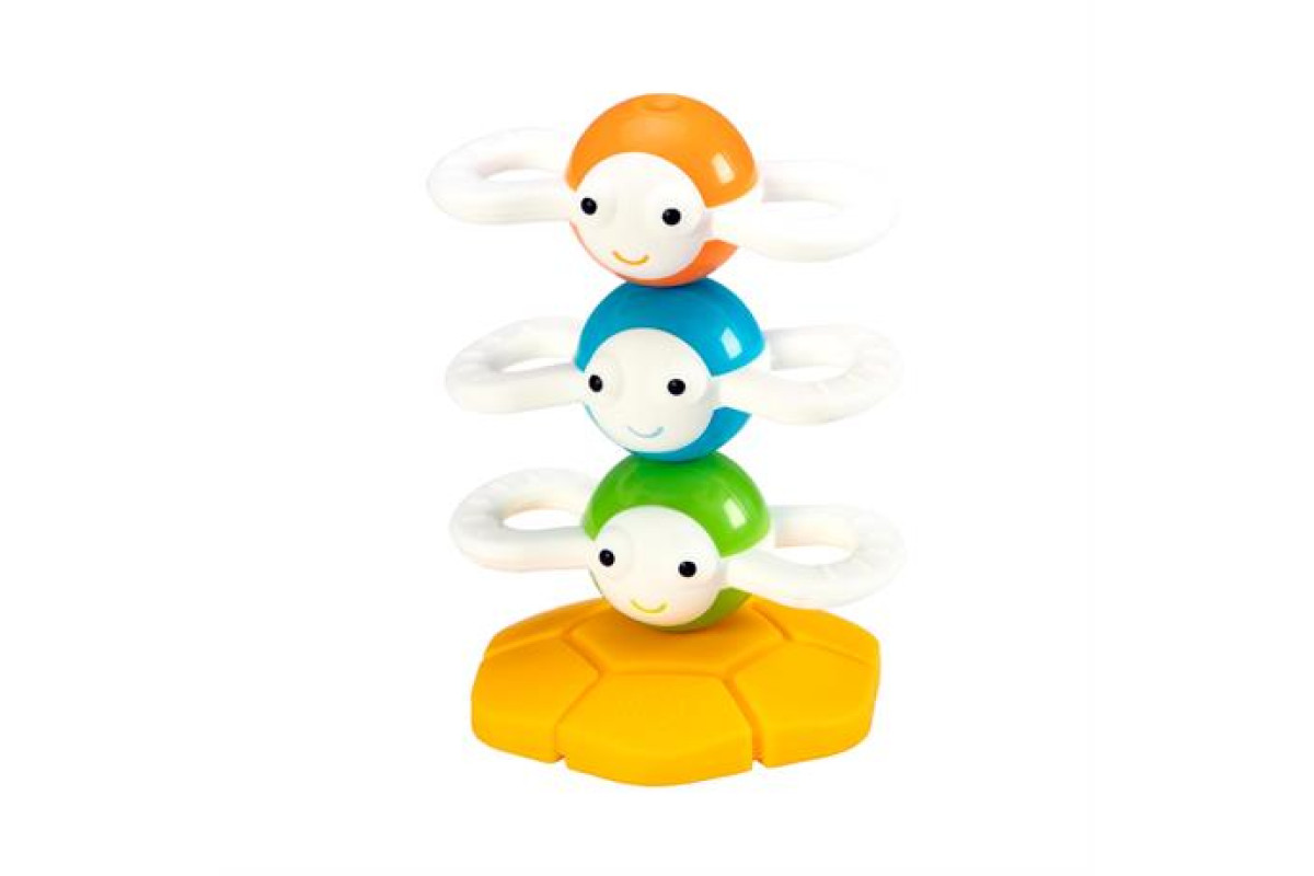 Ці три бджоли з'єднуються за допомогою вбудованих магнітів і складаються поверх одна одної в пірамідку на основу у вигляді сот. Повертайте бджілок, качайте, а потім розділяйте, щоб досліджувати кожну. Силіконові крильця з рельєфною поверхнею стимулюють тактильні відчуття малюка. Ще їх можна гризти, як прорізувач.