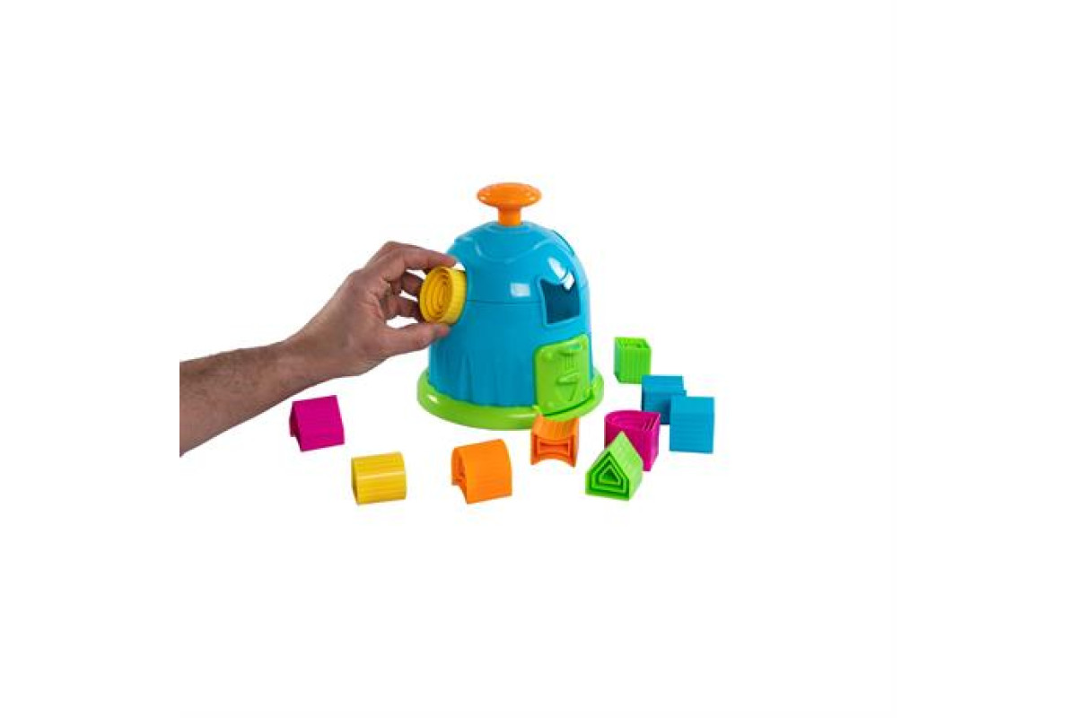 Ось як працює: якщо натиснути кнопку на даху, форма отворів зміниться. Щоб вийняти фігурки, необхідно відкрити дверцята сортера.