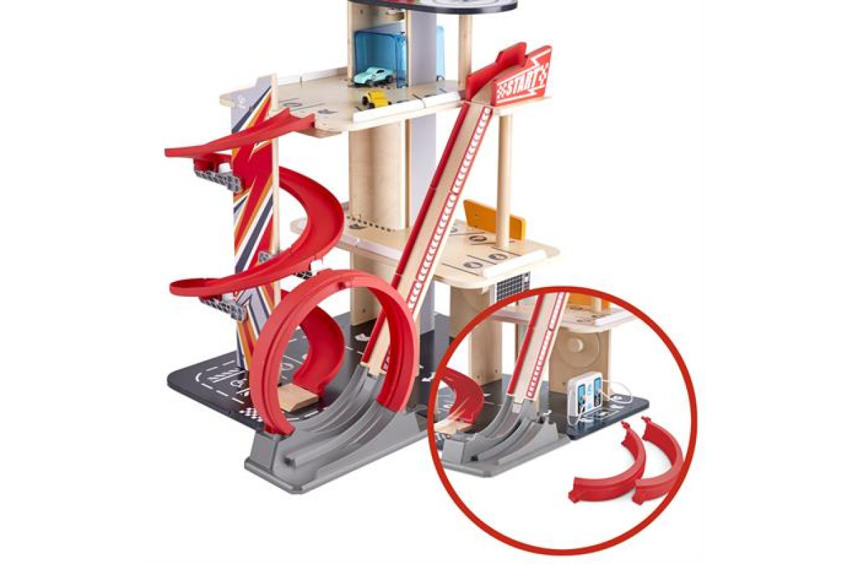 • У гаражі є дві доріжки для трюків. Відправляйте свої іграшкові машинки зі свистом вниз по спіральній доріжці, щоб кинути виклик гравітації на 360-градусній петлі.