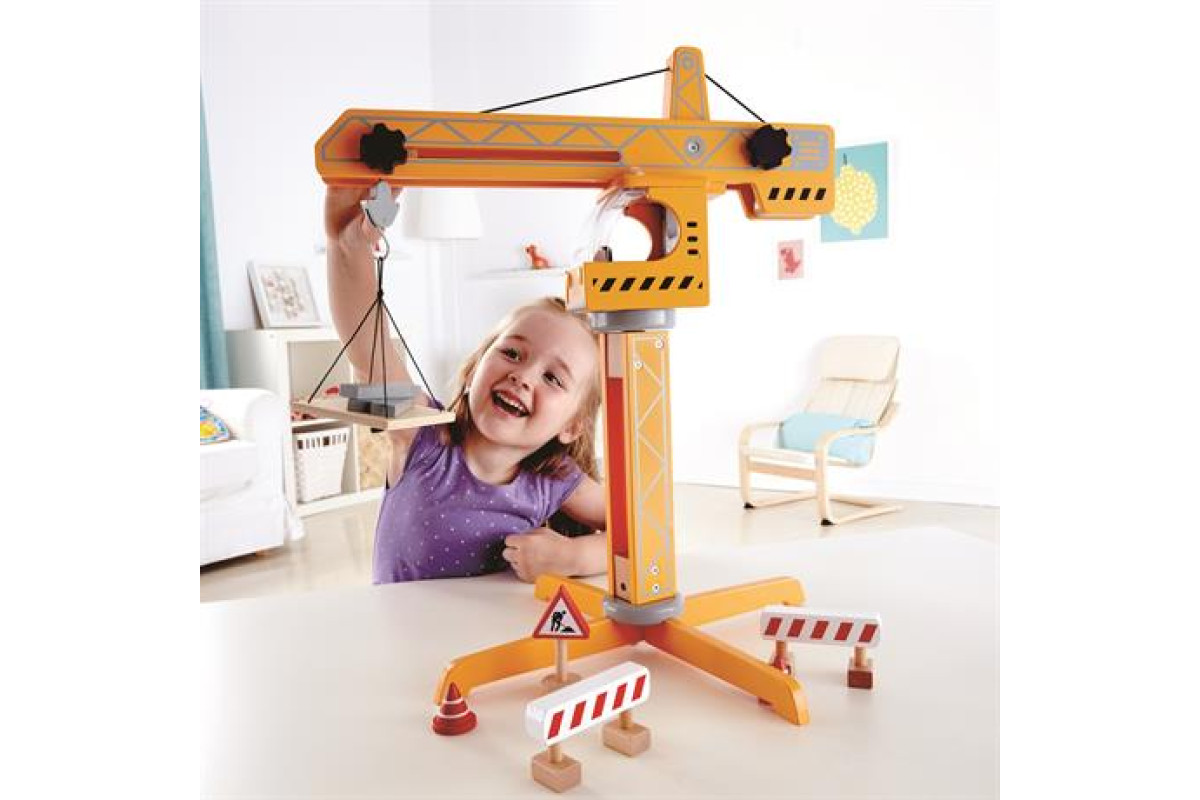 На кожному будівельному майданчику є високий баштовий кран. Підіймальний кран від Hape – реалістична іграшка з набором необхідних аксесуарів. Що в наборі: набір огорож, попереджувальних знаків і комплект вантажів. Іграшка обертається навколо своєї осі. Вантаж можна переміщати по стрілі вперед-назад за допомогою регуляторів на торці.