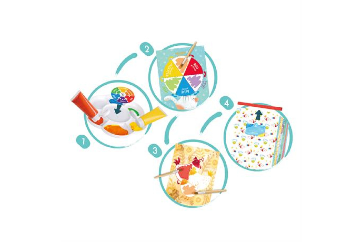 Цей набір для занять включає 3 тюбики з нетоксичною фарбою червоного, жовтого і синього кольорів, 2 пензлі, колірне коло, палітру для фарби, альбом із завданнями для занять із мольбертом.