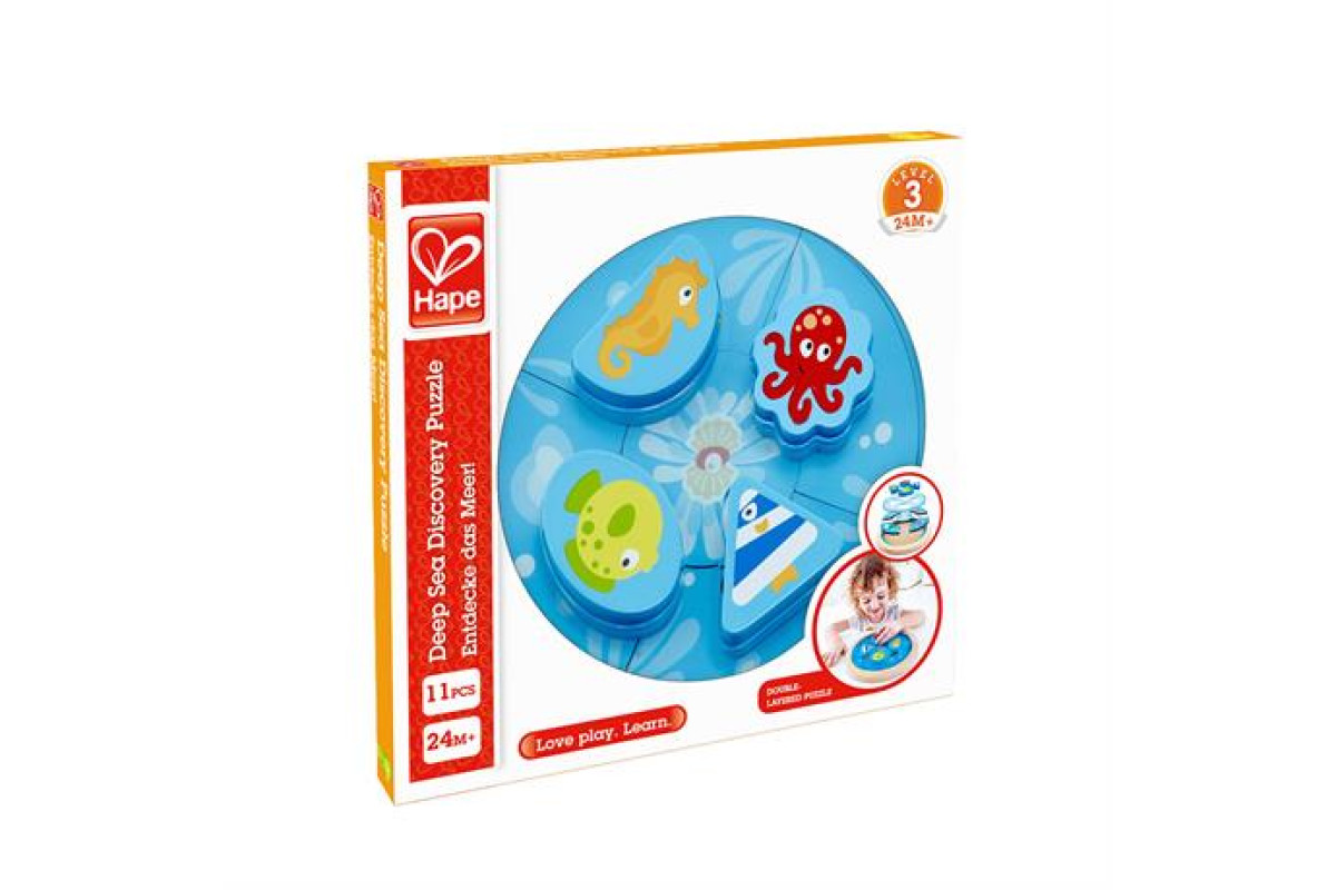 Дерев'яний пазл-головоломка Глибоке море від Hape барвиста розвивальна іграшка для малюків від 2 років. Іграшка складається з 2-х шарів. Нижній шар це традиційний пазл з 5 елементів. Верхній шар це пластикова рухома вставка з отворами у формі морських мешканців. У ці отвори малюк зможе помістити 4-х дерев'яних водоплавних. Діаметр ігрового поля: 20,8 см. Рекомендований вік: 2 роки.