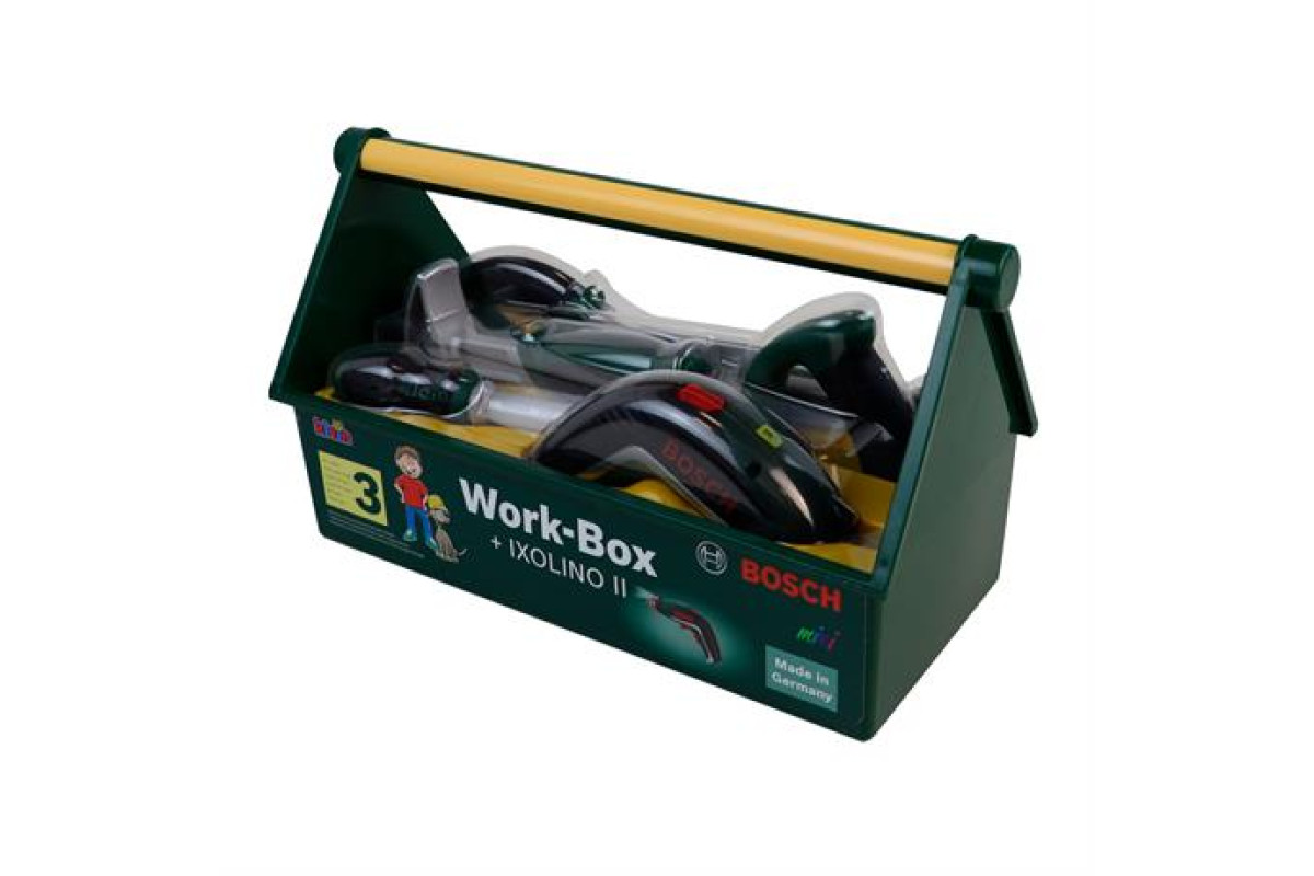 Набір іграшкових інструментів Bosch Klein складається з: шурупокрута Ixo, молотка, пили, плоскогубців, викрутки та гайкового ключа. Всі інструменти можна скласти в ящик.