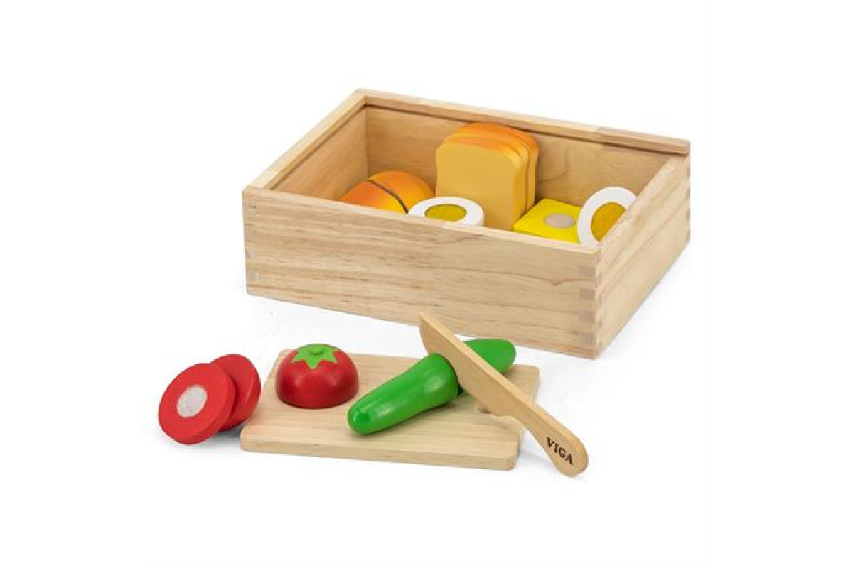 Ігровий набір від Viga Toys з муляжами продуктів доповнить ігри з дитячими кухнями. Дитина познайомиться з кулінарною справою і технологією приготування нескладних страв. Тренуючись на іграшковій їжі, діти запам'ятають поєднання продуктів і незабаром зможуть самостійно приготувати справжній сендвіч. Це хороша гра для розвитку соціальних навичок, вміння піклуватися. Діти будуть готувати для рідних, долучатися до хатніх справ, що дасть їм відчуття значущості, впевненості у своїх здібностях. Вправляючись у «нарізці» продуктів, малюки також зміцнюють м'язи рук і спритність пальців, зорово-моторну координацію.