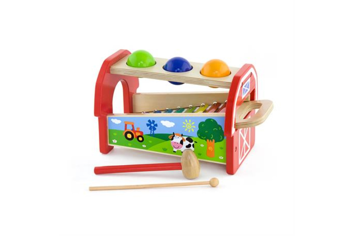 Малюкові необхідно взяти в руки великий дерев'яний молоточок і забити кульки в отвори. При падінні вони будуть видавати мелодійні звуки, б'ючись об пластини ксилофона. Музичний інструмент із ручкою при бажанні можна вийняти та грати окремо, використовуючи маленький молоточок.