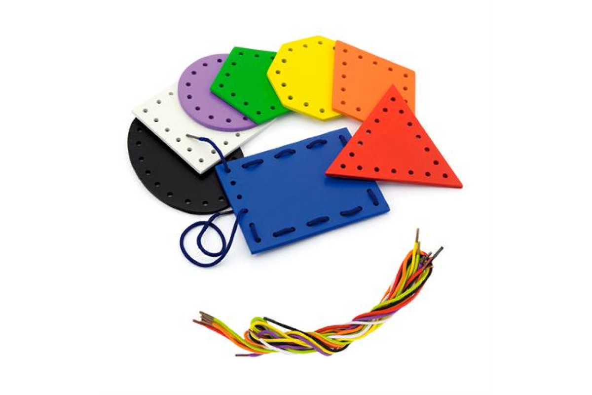 В отвори по краях кожної фігури необхідно протягнути шнурок із набору відповідного кольору. Кілька дітей можуть змагатися в часі та акуратності виконання. Це також корисне заняття на кмітливість і посидючість. Дошкільнята можуть грати самостійно, показувати один одному найкращі варіанти виконання завдання.
