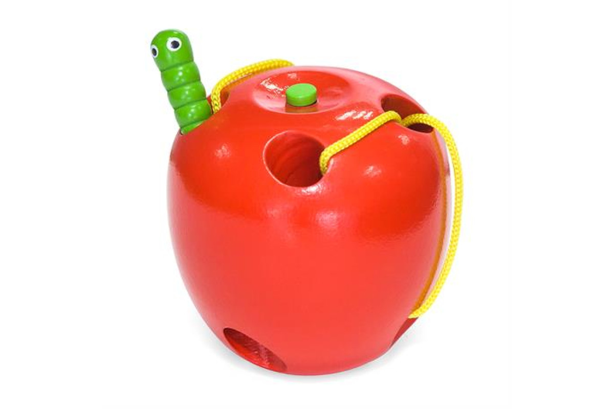 Ця розвивальна іграшка виконана з дерева в формі яскраво-червоного плода, в якому оселився маленький зелений черв'ячок. Він пересувається ходами всередині яблучка. Простежити за його рухом можна за допомогою жовтого шнурка. Для цього дитині треба постаратися правильно просунути його в усі погризені черв’яком дірочки.