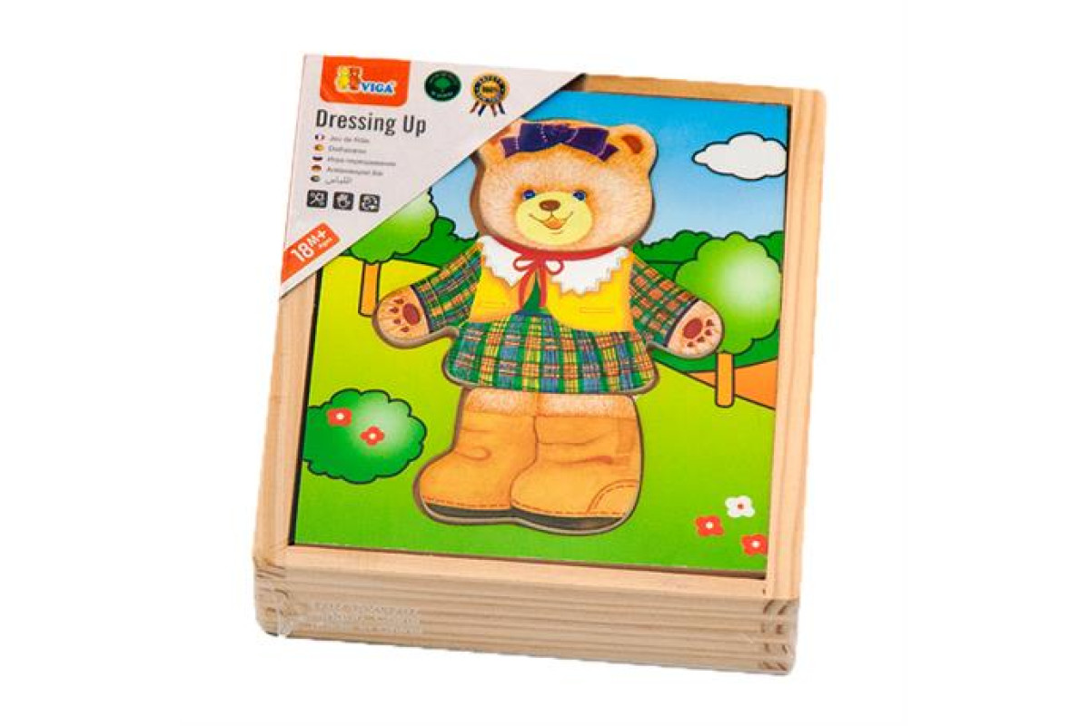 Набір складається з 18 дерев'яних елементів і ящика. У кришці є поглиблення у формі ведмедика, куди вставляються деталі пазла. Шість комплектів одягу, які можна комбінувати між собою.