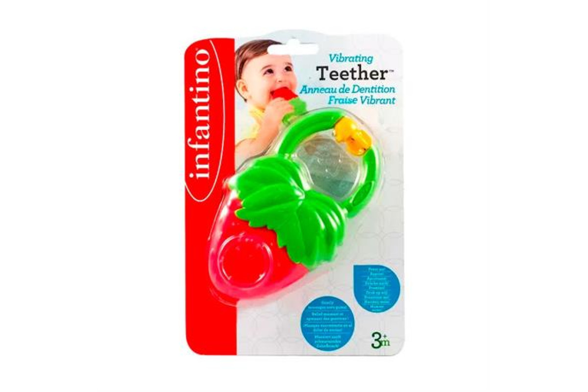 Прорізувач для зубів із вібрацією Infantino Полуниця призначений для дітей від 3 місяців, безпечний для здоров'я.
