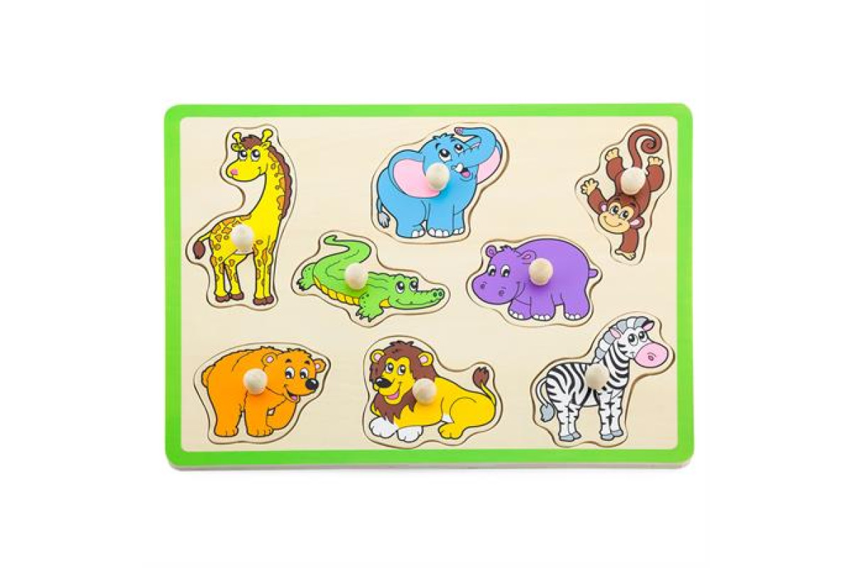 Ця розвивальна іграшка чудово тренує моторику рук і логічне мислення. Дитині необхідно збагнути не лише куди, але і як правильно вставити картинку. Завдяки ручкам у центрі вкладок, малюк не сплутає лицьову сторону зі зворотом, і легше запам'ятає розташування звіряток на основі.