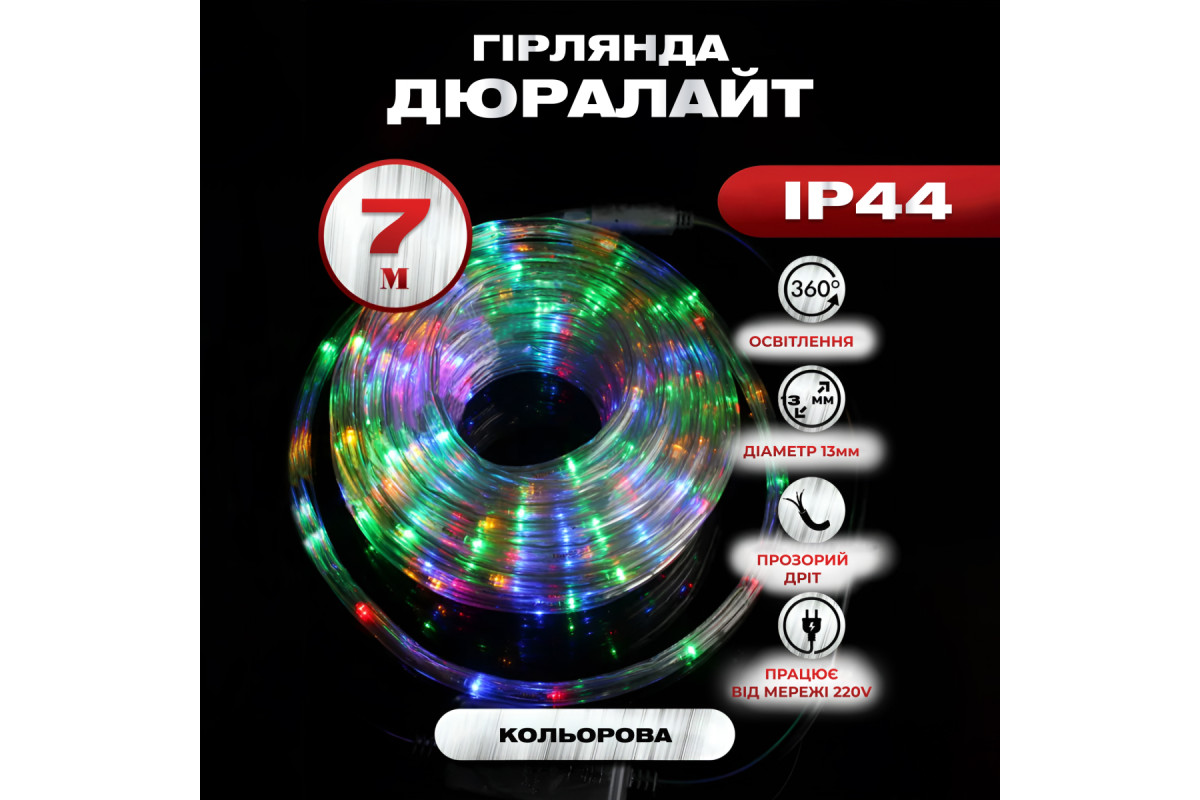 Мрієте про затишну та елегантну атмосферу у вашому домі, саду чи на терасі? Гірлянда Дюралайт – це саме те, що потрібно! Її 7 метрів сяйва з 240 кольорових світлодіодів перетворять будь-який простір на казкову феєрію. Гірлянда Дюралайт - це універсальний елемент декору. Її можна використовувати як на вулиці, так і в приміщенні. Вона чудово підійде для декорування фасадів будинків, дерев, кущів, терас, альтанок, а також веранд, кафе та ресторанів. Морозостійкі матеріали, з яких виготовлена гірлянда, дозволяють використовувати її навіть взимку.
