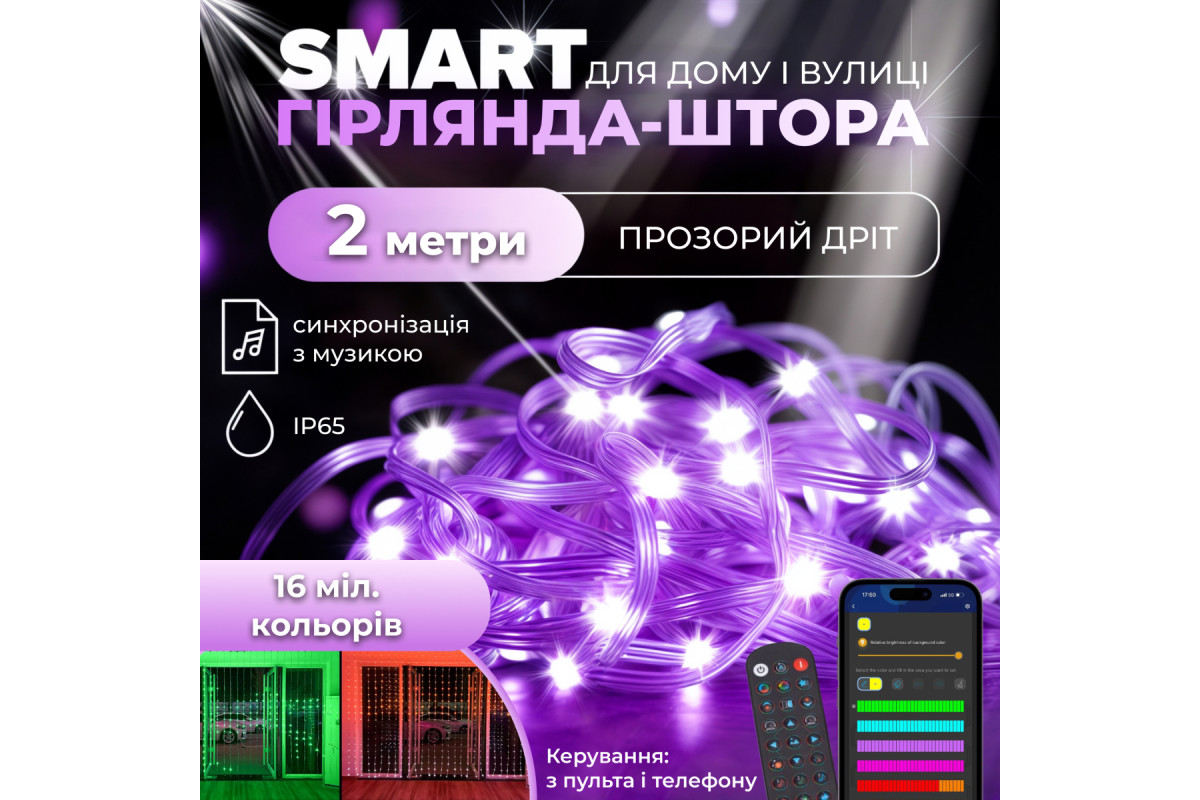 Смарт-гірлянда Штора – сучасне рішення для декорування приміщень. Гірлянда являє собою центральний дріт, від якого відходять нитки зі світлодіодами. Завдяки такій конструкції її з легкістю можна закріпити на карнизі, у дверях, а також використовувати для оформлення інтер'єрів різного призначення та фотозон. У спеціальному додатку можна легко керувати гірляндою зі смартфона, вибираючи колір, режим роботи та яскравість свічення.
