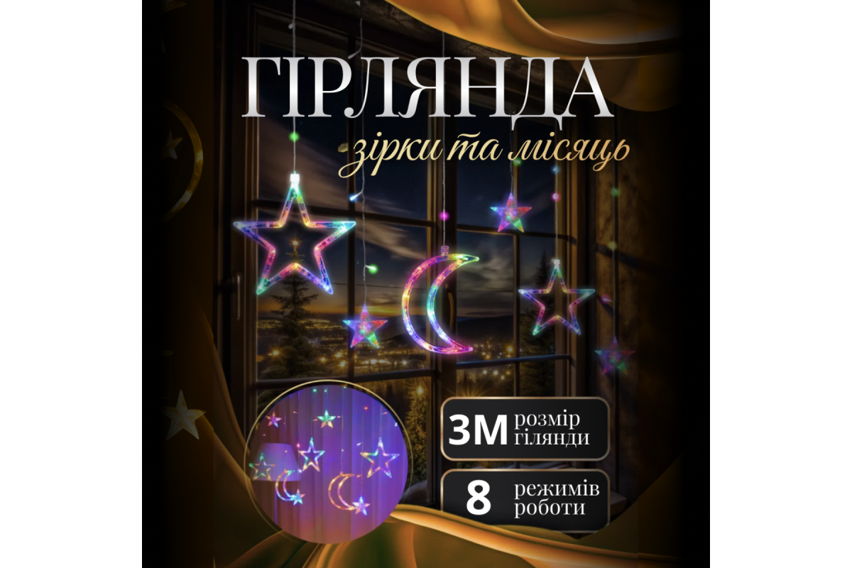Дванадцять мерехтливих фігур місяця і зірок гірлянди "Місяць і зірки" створюють чарівну атмосферу казки та затишку. Гірлянду можна повісити на вікно, щоб створити святкову атмосферу. Прикрасити нею стіну або камін, щоб додати сяйва. Також гірлянду можна використовувати для декорування ялинки або створіть фотозону, щоб закарбувати спогади про свято.
