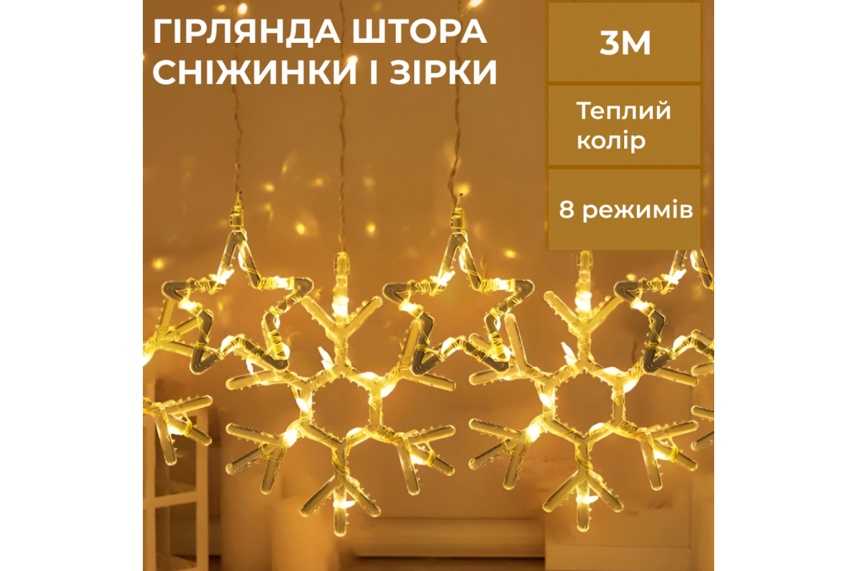 Гірлянда-штора Зірки та сніжинки, 3*0,9 м, 10 фігур, жовтий