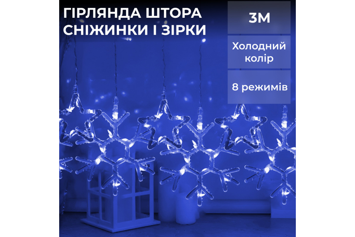 Гірлянда-штора Зірки та сніжинки, 3*0,9 м, 10 фігур, синій