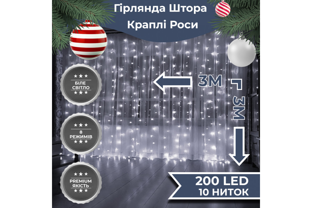 Гірлянда-штора Роса 200 LED, 3*3 м, білий