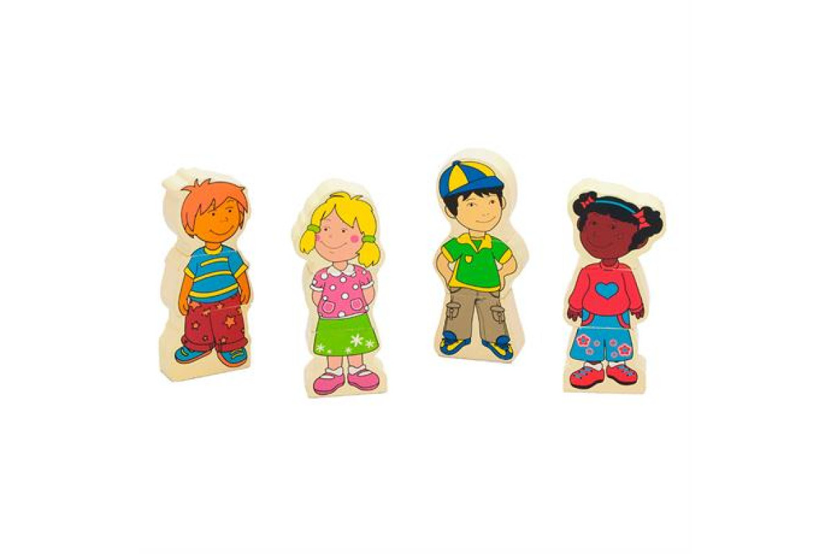 Набір містить 12 елементів з двостороннім малюнком. З них можна зібрати об'ємні фігурки 4 дівчаток і 4 хлопчиків різних рас. Діти вчаться підбирати елементи та складати ціле з частин, а також отримують уявлення про людину і відмінності людських рас. Для безпеки магніти розміщені всередині дерев'яних елементів.