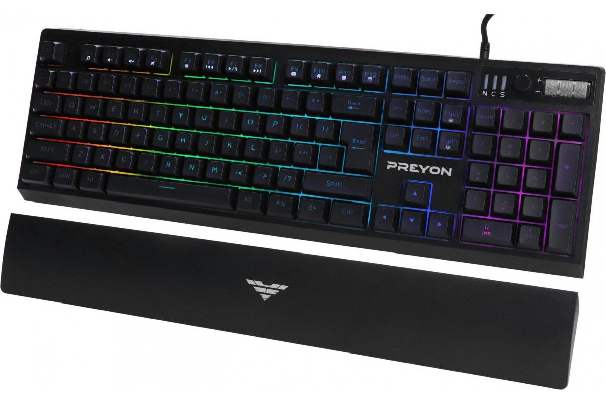 Ігрова клавіатура PREYON Long Claw Alpha складається зі 104 клавіш, позначених чітким шрифтом і оснащених підсвічуванням. Це робить його таким же зручним у використанні в сутінках, як і вдень. Для більшого комфорту користувача клавіатура оснащена підставкою для зап'ястя, яка кріпиться за допомогою магнітів.
