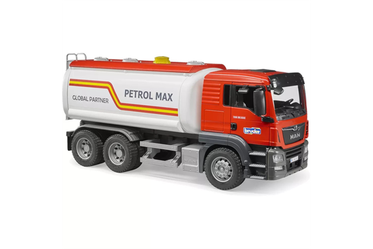 Іграшка Bruder – це зменшена копія бензовоза (танкера) MAN TGS, що використовується для перевезення нафтопродуктів і заповнення ними резервуарів.