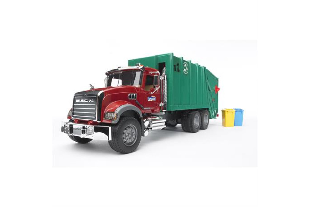 Іграшка Bruder сміттєвоз MACK Granite із заднім завантаженням.