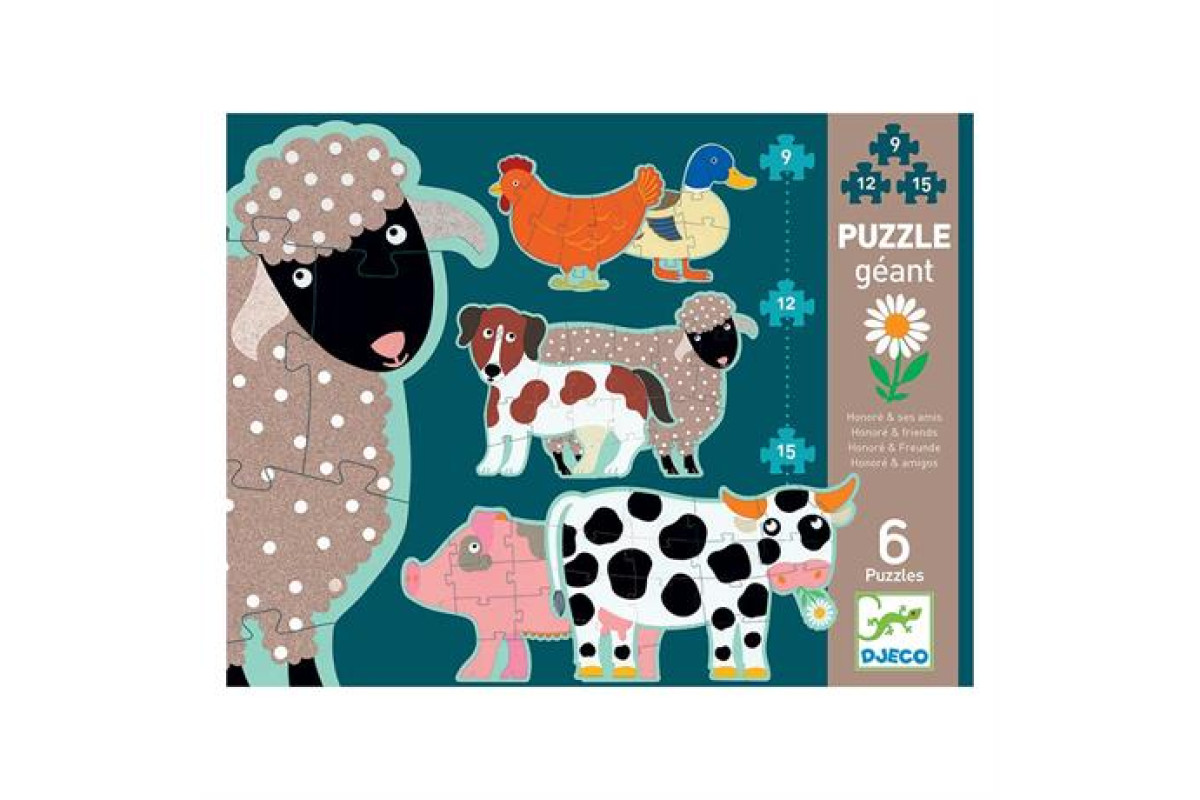 Пазл-гігант DJECO Овечка та друзі 1,4 м для збору 6 фігурок тварин має деталі великого розміру: 2 пазла з 9 елементів (курка й качка) – 2 пазла з 12 елементів (собака та вівця) – 2 пазлу з 15 елементів (корова і свиня). Висота пазла 1,4 м.