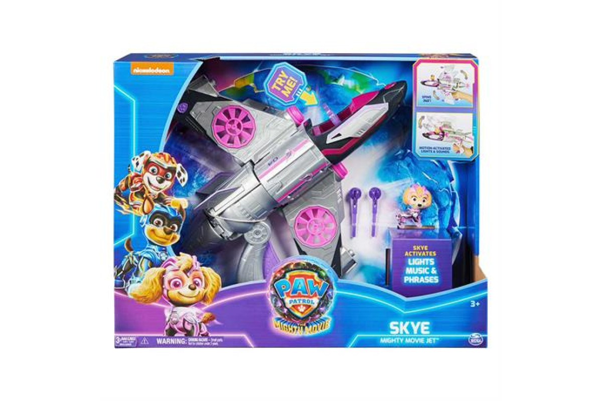 Ця розкішна іграшка стане чудовим подарунком для прихильників мультфільму «Щенячий патруль». Скай одягнена в свою рожеву форму з фільму «Щенячий патруль: Мегакіно» з напівпрозорими елементами, що світяться, та крутим шоломом. Розташуйте фігурку Скай у кабіні її суперджета, щоб активувати світлові ефекти.