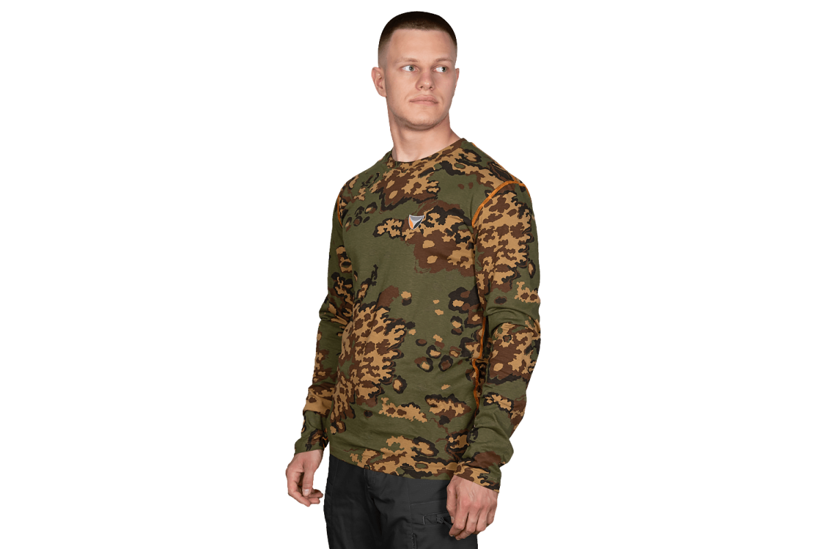На відмінно від попередньої ітерації цієї моделі, шви оброблені яскравим, помаранчевим кольором, а на грудях з лівої сторони логотип нашої компанії. В купі з іншим маркованим одягом це додає видимості на місцевості, що корисно для мисливців, але не радимо використовувати цей лонгслів як єдину марковану річ.