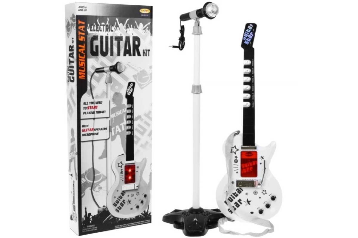 Біло-чорний ігровий набір складається з гітари з додатковими звуковими функціями на плечовому ремені. У комплект також входить мікрофон на регульованій підставці. Музична іграшка виготовлена з якісних матеріалів, що подарує задоволення надовго.