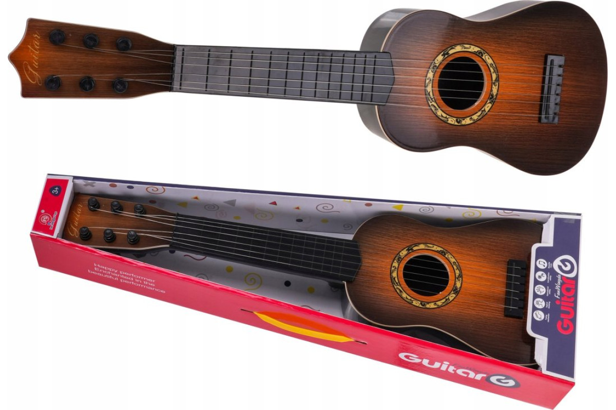 Розроблений з увагою до деталей, цей мініатюрний справжній інструмент має гриф із 6 металевими струнами та язичками , а звук надзвичайно близький до звуку справжньої класичної гітари. Крім того, іграшка виготовлена з якісного пластику з малюнком, що імітує дерево , що гарантує міцність і довговічність. Це ідеальний спосіб почати свою музичну пригоду в молодому віці.