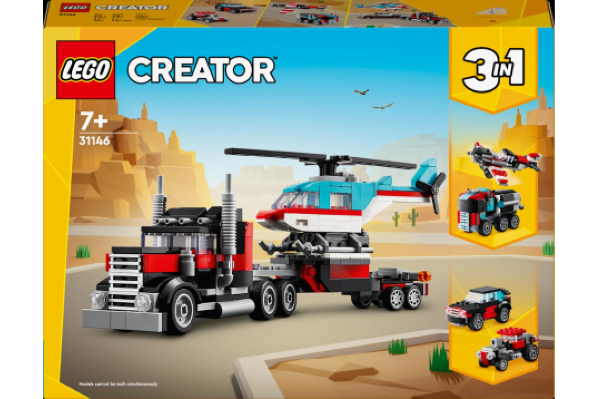 Стрімкі пригоди чекають на хлопчиків та дівчаток віком від 7 років завдяки набору LEGO® Creator Бортова вантажівка з вертольотом (31146). З 270 деталей набору 3-в-1 вони зможуть зібрати неймовірну вантажівку з рухомими колесами, яку може перевозити на своєму причепі вертоліт LEGO з рухомими лопатями гвинта.
