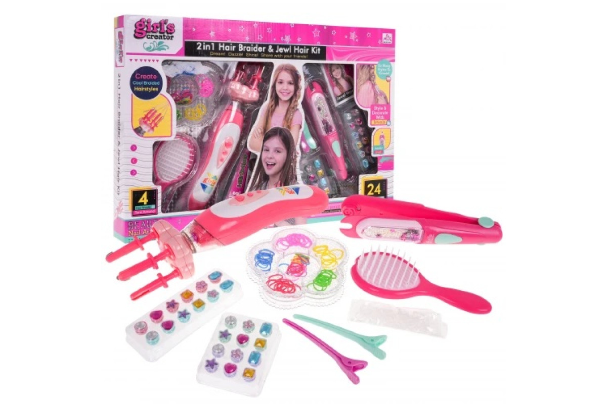 Гарно укомплектований набір з машинкою для плетіння волосся та машинкою для нанесення прикрас для волосся — пропозиція для дітей від 6 років. Набір складається з 24 елементів. Є машинка для плетіння волосся і машинка для нанесення прикрас на волосся, а також гребінець, ромби і резинки для волосся. Машинка для плетіння кіс живиться від батарейок 2 х АА 1,5 В, батарейки в комплект не входять. Користуватися машинкою дуже просто, просто вставте 3 пасма волосся в отвори шпильок і перемістіть ромбовидну кнопку вгору. Готовий! Машинка для нанесення бісеру на волосся зовні нагадує праску. Він не живиться від акумулятора. Щоб нанести аплікацію на волосся, покладіть прикраси на верхню частину бритви, а шпильку на нижню. Потім поміщаємо пасмо волосся в машинку і притискаємо її. Готовий!! Аплікації та шпильки багаторазові.