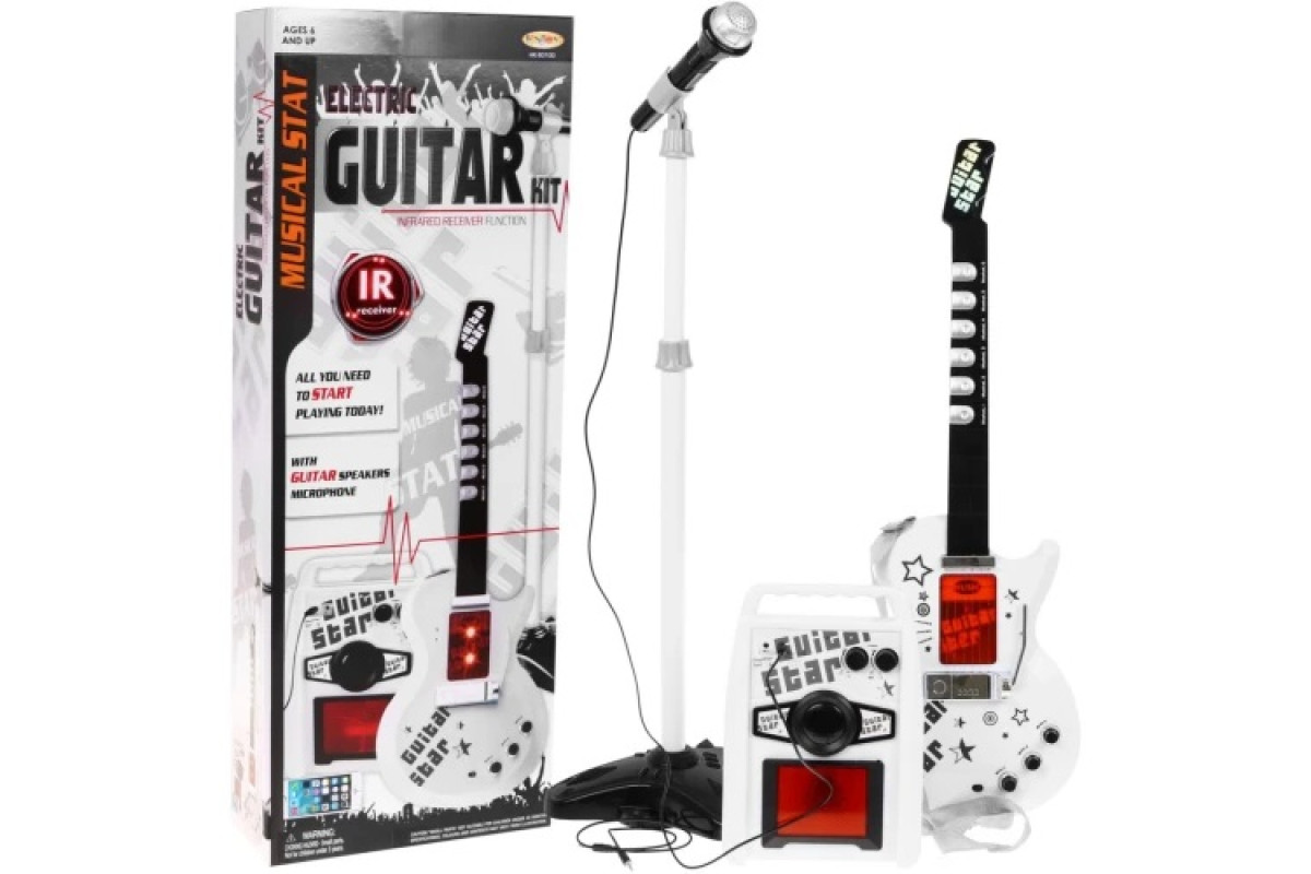Набір складається з гітари з додатковими звуковими функціями на грифі. У комплекті також є комбік, тобто підсилювач, і мікрофон на регульованій підставці. Музична іграшка виготовлена з високоякісних матеріалів, що забезпечить забаву на довгий час.