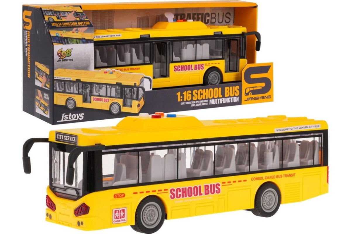 Жовтий автобус масштабу 1:16 - це реалістична іграшка для дітей від 3 років , повна інтерактивних функцій. Транспортний засіб має двері, що відкриваються , якими можна керувати за допомогою ручки, розташованої над ними.